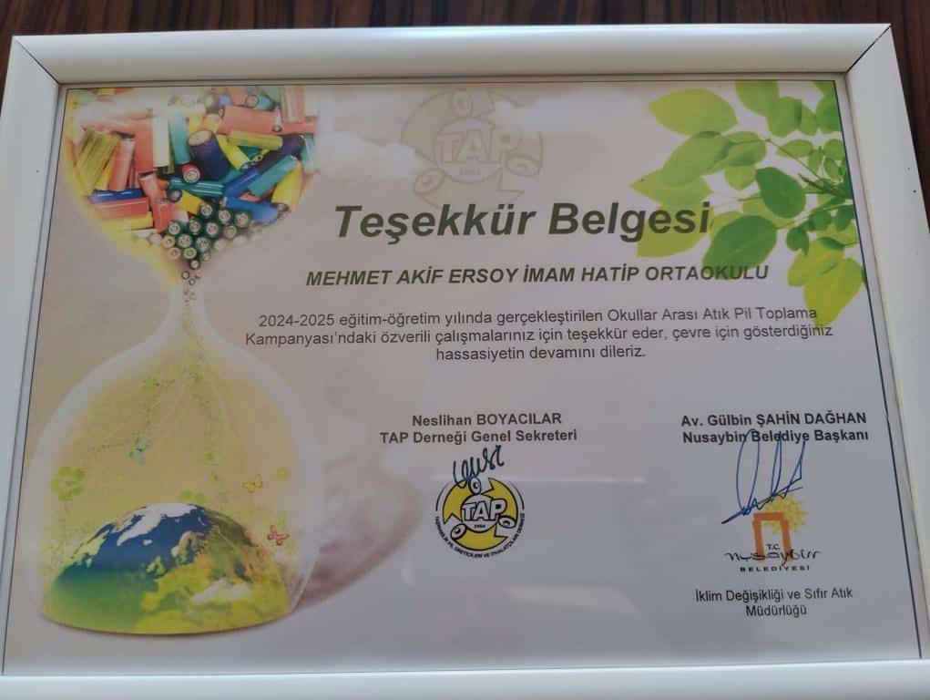 Atık pil toplamada dereceye girdik. Bu sene arıtmalı su sebili kazandık. İlgilerinden dolayı Nusaybin Belediyesi İklim Değişikliği ve Sıfır Atık Müdürü Şehmus Biltekin Bey'e teşekkür ederiz.